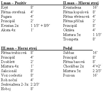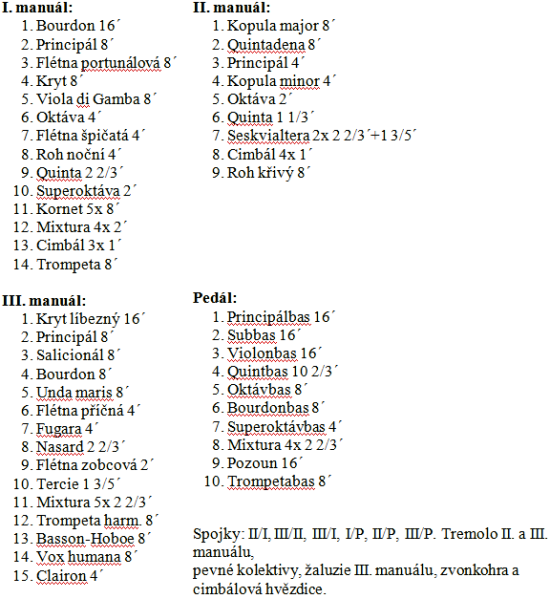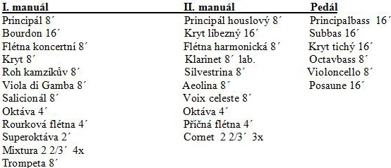 Do původní varhanní skříně z konce 18. století postavila r. 1912 firma Jan Tuček z Kutné Hory.